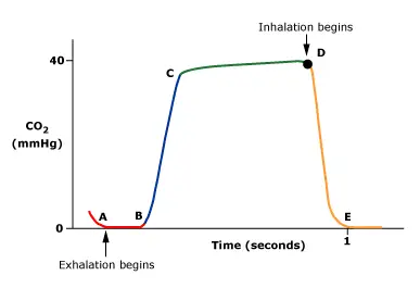 კორელაცია PaCO2-თან – ETCO2 წარმოადგენს CO2-ის კონცენტრაციის ან არტერიულ სისხლში პარციალური წნევის (PaCO2) არაინვაზიურ შეფასებას. ეს ეფუძნება დაშვებას, რომ ამოსუნთქვის ბოლოს გაზი ძირითადად ალვეოლური გაზია, ხოლო ალვეოლური CO2-ის დაჭიმულობა (PACO2) პრაქტიკულად ფილტვის კაპილარული დაჭიმულობის იდენტურია, რაც თავის მხრივ PaCO2-ის ტოლფასია. ჯანმრთელ პაციენტში ნორმალური ფილტვებით PACO2-PETCO2 გრადიენტი 5 მმHg-ზე ნაკლებია და გამოხატავს ალვეოლური გაზის განზავებას არაპერფუზირებული ალვეოლებისგან (ალვეოლური მკვდარი სივრცე) მიღებული CO2-ისგან თავისუფალი გაზით. ეს სხვაობა იზრდება, თუ არსებობს ფილტვების ვენტილაციისა და პერფუზიის შეუსაბამობა (V/Q), რაც აღინიშნება ფილტვის დაავადებების, ფილტვის ემბოლიის, გულის დაბალი წუთმოცულობის და ჰიპოტენზიის მქონე პაციენტებში. ეს სხვაობა ასევე შეიძლება გაიზარდოს ასაკის მატებასთან ერთად და ქირურგიული პოზიციონირების დროს. ამ მიზეზით, PaCO2-ის გაზომვა აუცილებელია, როცა ვენტილაციის ზუსტი კონტროლი მნიშვნელოვანია (მაგ., პაციენტები გაზრდილი ინტრაკრანიული წნევით).
