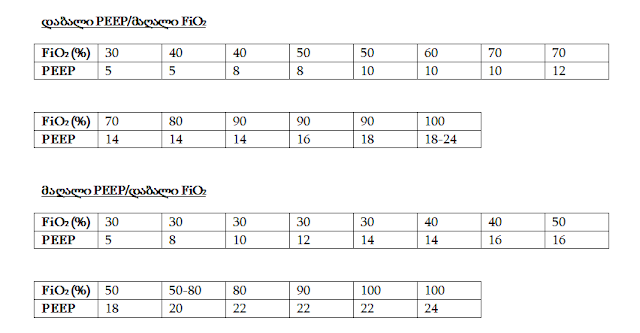 გამოიყენეთ PEEP მინიმუმ 5 სმ H2O. შესაძლებელია FiO2/PEEP-ის ზრდადი კომბინაციების გამოყენება (სავალდებულო არ არის).